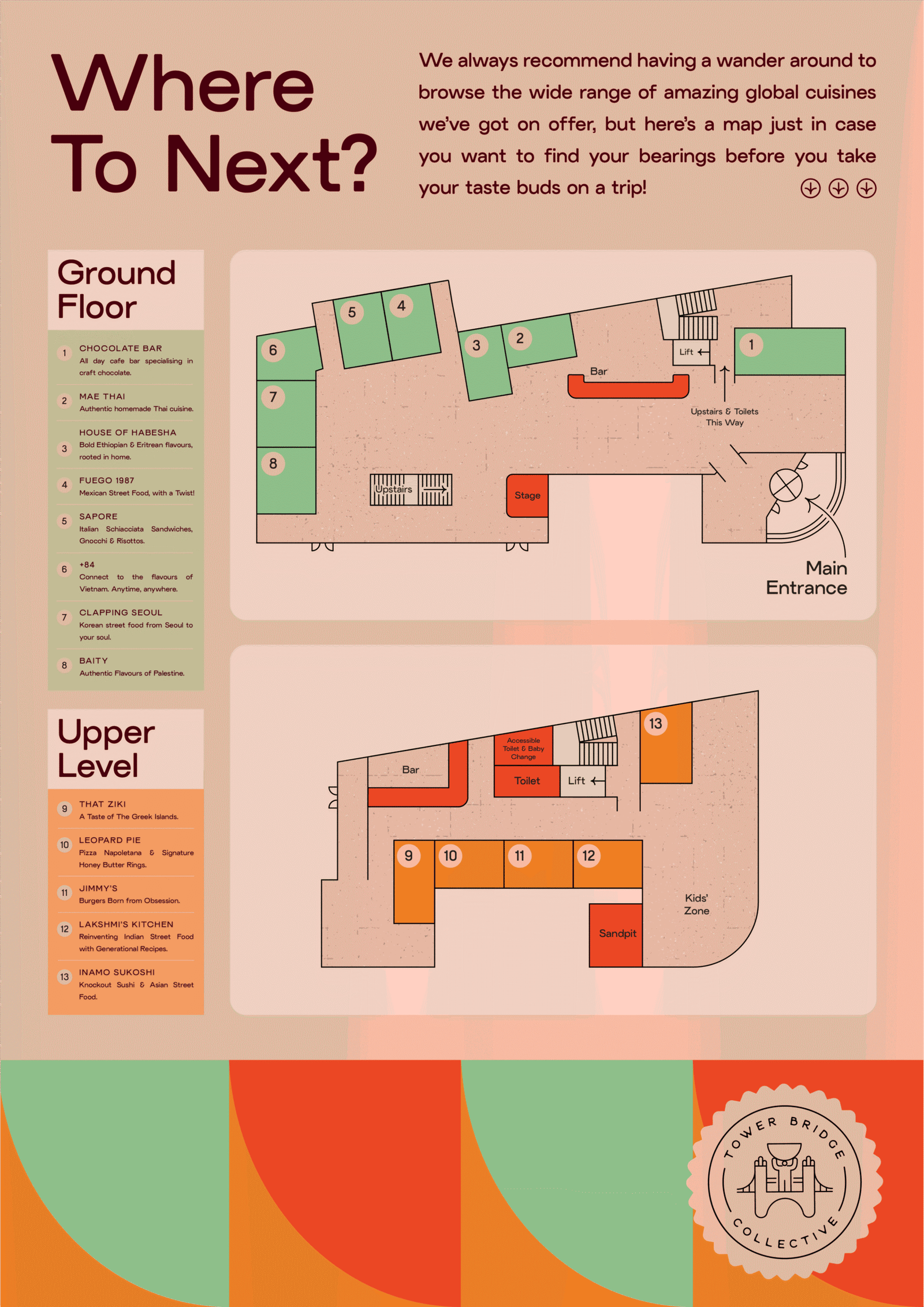 Tower Bridge Collective is home to a world of flavours, all under one roof. From quick bites to slow sips, familiar favourites to bold new discoveries, there’s something here for every craving. Think of this map as your guide, whether you’re hunting down your go-to dish, exploring something adventurous, or simply wandering until something catches your eye.